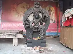 As per Hindu legend, Shiva appeared in the form of Andakasura samhara murthy to slay the demon king Andakasura.[1] Andakasura was a demon who attained powers close to immortality on account of his severe penance to Brahma, the Hindu god of creation. The boon attained had just one condition that when he lusts his mother, he would be killed. He made undue use of his powers and was troubling humans and celestial deities. During one such encounters, he started lusting toward Parvathi, the wife of Shiva and who was like his mother. Shiva appeared as Andakasura samhara murthy and slayed Andaka with his trident. Realising his mistake, he pleaded Shiva to make him a devotee of his in the next birth. It is believed that Shiva readily agreed and Andaka was born as Gana Bhringi.[2]