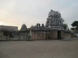 Veerateeswarar temple is located in Thirukoilur, a town panchayat located on the banks of Then Pennai river, located 40 km (25 mi) from Villupuram. The temple has two parallel structures, each of which has a three-tiered Rajagopuram, the gateway tower. The temple has large granite rectangular walls that houses all the shrines. The sanctum sanctorum houses the image of Veerateeswarar in the form of Lingam, an iconic form of Shiva. There is an Ardha Mandapa and a Mukha mandapa, pillared halls leading to the sanctum. The first precinct has the shrines of Vinayakar, Murugan, Durga, Dakshinamurthy and Chandikeswara. The first precinct also houses metal image of Nataraja, Somaskanda and Andhakasura. The second structure houses the image of Periyanayagi. Like the Shiva temple, here also the sanctum is approached through an Ardha Mandapa and Mukha mandapa. There is a precinct around the sanctum.[3][5]