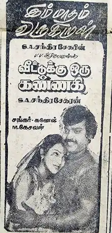 Veetuku Oru Kannagi (transl. A Kannagi for the house) is a 1984 Indian Tamil-language film, directed and produced by S. A. Chandrasekhar. The film stars Vijayakanth, Sujatha, Nalini and Sangili Murugan. It was released on 1 July 1984.[1]