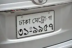 In Bangladesh, the Bangladesh Road Transport Authority (BRTA) issues vehicle registration plates for motor vehicles. The vehicle registration plates in Bangladesh use the Bengali alphabet and Bengali numerals. They are produced by Bangladesh Machine Tools Factory, located in Gazipur.[1] The current version of vehicle registration plates started in 1973, and the current digital number plates have been in use since 2012. The international vehicle registration code for Bangladesh is BD.