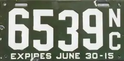 1914–15 | White serial on green porcelain plate; vertical "NC" at right and "EXPIRES JUNE 30-15" at bottom | none | 12345 | 1 to approximately 17000 | |