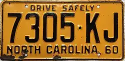 1954 | Embossed black serial on golden yellow plate; "NORTH CAROLINA 54" or "N.C.", slogan and "54" at bottom | none, or "DRIVE SAFELY" between state abbreviation and year | 123-456 | 100-001 to 760-000 |