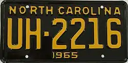1965 | Embossed golden yellow serial on black plate; "NORTH CAROLINA" at top; "1965" centered at bottom | none | A-1234 AB-1234 |