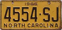 1966 | Embossed black serial on golden yellow plate with border line; "1966" centered at top; "NORTH CAROLINA" at bottom | none | A-1234 AB-1234 |