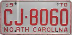 1970 | Embossed red serial on reflective white plate with border line; "19" at top left and "70" at top right; "NORTH CAROLINA" at bottom | none | A-1234 AB-1234 |