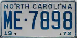1972 | Embossed blue serial on reflective white plate with border line; "NORTH CAROLINA" at top; "19" at bottom left and "72" at bottom right | none | A-1234 AB-1234 |
