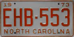 1973 | Embossed red serial on reflective white plate with border line; "19" at top left and "73" at top right; "NORTH CAROLINA" at bottom | none | ABC-123 | AAA-101 to approximately HVA-999 | |
