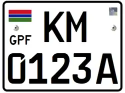 Registration plates of the Gambia have, since 2019 have been coloured yellow or white with black lettering. To the left is the Gambia flag and the letters "GPF". The plates are in the standard European size, and feature the German FE font. The first set of letters denote the city of issue, such as BJL for Banjul.