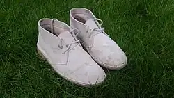 They are sometimes considered light boots, and can essentially be considered a subset of chukka boots or desert boots although vellies tend to have a lower topline.[2] Veldskoene soles are sometimes cut from old car tyres rather than crepe rubber; the leather used varies with local supply. In Namibia, kudu and seal leather is commonly used.[3]