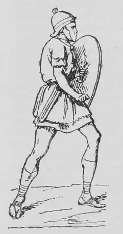 Velites (Latin: [ˈweːlɪteːs]; sg.: veles) were a class of infantry in the Roman army of the mid-Republic from 211 to 107 BC. Velites were light infantry and skirmishers armed with javelins (Latin: hastae velitares), each with a 75cm (30 inch) wooden shaft the diameter of a finger, with a 25cm (10 inch) narrow metal point, to fling at the enemy.[1] They also carried short thrusting swords, or gladii, for use in melee. They rarely wore armour as they were the youngest and poorest soldiers in the legion and could not afford much equipment. They did carry small wooden shields called parma for protection, and wore headdresses made from wolf skins so their brave deeds could be recognized.[2][3] The velites were placed at the front partly for tactical reasons, and also so that they had the opportunity to secure glory for themselves in single combat.[2]