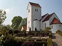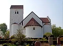 Veng Church (Veng Kirke) was constructed some time after 1100, probably as a replacement for an earlier wooden structure. It was built of limestone blocks, as were many early Danish monasteries, in the Romanesque style. It had a flat timber roof, a single nave, a choir, and an apse with two transepts, each with its own apse. The outside of the church retains several carved stones and other decorations from the original building. Even before the Danish Reformation there were no remains of Veng Abbey except for the church. Veng Church is now a parish church in the Diocese of Aarhus. [5][6]