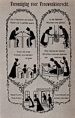The Vereeniging voor Vrouwenkiesrecht (Association for Women's Suffrage) was a women's rights organization active in the Netherlands from 1894 to 1919. It was devoted to women's suffrage. It was the main women's suffrage movement in the Netherlands. The Vereeniging changed its name in 1919 and would fuse with another association in 1930 and again in 1949 and still exists today.