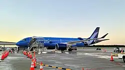 A Breeze Airways Airbus A220-300 at the terminal ramp