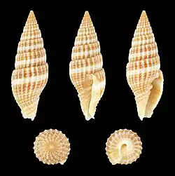 (Original description) The shell is acuminately turreted. The spire is sharp. The whorls are longitudinally ribbed. The ribs are narrow and close-set. The interstices are impressly cancellated. The shell is yellowish brown, encircled with a single white line. The columella is four-plaited. The base is recurved in a twisted manner.[2]