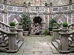 The villa was the subject of significant attention during the Second World War. Initially used as the main office of the Bank of Tuscany, the villa was seized by German forces and used as a military headquarters. Under the control of Nazi Germany, in 1944, the villa underwent bombardment by machine gun and artillery fire of the Allied forces, causing significant damage to the house and gardens.[5] At one point, a German mortar shell penetrated the roof of the villa and became lodged without detonating in the library.[1][2]