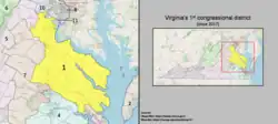 Virginia's first congressional district is a United States congressional district in the commonwealth of Virginia. It streches from the Richmond suburbs towards the Northern Neck and Middle Peninsula. The district encompasses the Historic Triangle of Jamestown, Williamsburg, and Yorktown. It has been represented by Republican Rob Wittman since 2007.
