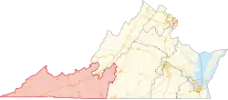 Virginia's ninth congressional district is a United States congressional district in the Commonwealth of Virginia, covering much of the rural southwestern part of the state. The district includes the city of Salem, along with the towns of Abingdon and Blacksburg. It has been represented by Republican Morgan Griffith since 2011. Griffith took office after defeating 14-term incumbent Democrat Rick Boucher.[4] With a Cook Partisan Voting Index rating of R+22, it is the most Republican district in Virginia.[3]