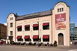 The restaurant is located in a Jugend building protected by the National Board of Antiquities. The building has previously served as Finnair's city terminal and VR Group's cargo storehold. The building had stood at the site since the early 20th century when it was part of an industrial and railroad area stretching from the railway station to the Töölönlahti bay. In 1978, the building's extension towards Töölönlahti was dismantled. The extension had hosted VR's construction works which had made locomotives up to the 1950s.[2]