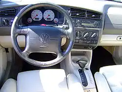 Reviews were generally positive, with testers praising the crisp handling and comfortable ride, as well as a greater level of refinement compared with the previous generation.[12] However, some reviews noted that the more sporty suspension tuning found in some trims made the car bouncy, especially on the expressway.[13] The manual transmission shifted crisply; however, the automatic transmission reduced acceleration noticeably. Some critics complained that the controls had some quirks, including a cryptic windshield wiper control, where the "off" position was unfittingly placed between the "intermittent" and "continuous" modes. If equipped, power window controls had the unusual arrangement of the front buttons located on the door, while the rear buttons were located on the center console. As with previous generations, the luggage compartment provided generous space. In earlier build cars, the glove compartment was deleted if the car was equipped with dual airbags, and in the later models (when airbags became standard equipment), the glove compartment was small and could barely hold the owner's manual and a folding paper map. There were also some complaints about the lack of cup holders in the earlier cars, as well as the lack of a safety interlock which would require the driver to press the clutch pedal prior to starting the car. The 1994 through 1996 models of the Jetta had some electrical issues causing the car not to start and shorting to occur in some of the electrical devices due to a non existent plastic V underneath the windshield, which was added in later models to divert rain water flowing to the electrical box.[14] The catastrophe of this glitch can be avoided by removing leaves and debris that have accumulated below the windshield and by installing adhesive weather sealant linings underneath the plastic cover directly onto the windshield.