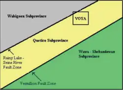 Most of the rocks in the park belong to the Archeon Quetico Subprovince, of the Superior Physiographic province, associated with the Kenoran Orogeny. These consist of schists and gneisses in the west and central portion of the park, and granitic rocks of the Vermillion Granitic Complex (2.69 to 2.64 Ga) in the east and southeast. The Kabetogama-Kenora dike swarm (2.2. to 2.1 Ga) follows a northwesterly trending Precambrian fault system. The northwest corner of the park contains metamorphosed rocks of the Wabigoon subprovince, which form a northeast trending greenstone belt. A lateral strike-slip fault separates the two subprovinces, referred to as the Rainy Lake-Seine River fault zone. It is this northwest area of the park, on the Kabetogama peninsula, which saw a gold rush from 1893 to 1898. The Little American Mine, on Little American Island, is one of 13 abandoned mines within park boundaries. Terminal moraines are found in the southern portion of the park, while the northern portion contains glacially scoured lake basins, but accumulations of glacial outwash and glacial till less than 100 feet is the norm. Lake Agassiz deposits are evident within the park, while glacial striations and glacial erratics are common.[5][7][8]