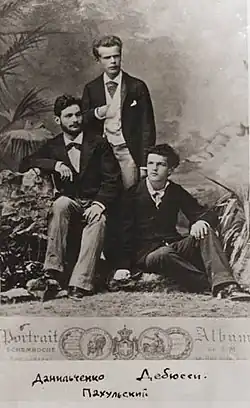 Claude Debussy, then a struggling composition student from the Paris Conservatoire, was employed in the von Meck household on three occasions between 1880 and 1882, as house pianist and music master to her children. He also accompanied the family on their visits to Europe. During their stay in Florence in 1880, he wrote his Premier Trio en Sol (First Trio in G) for a piano trio comprising himself on piano, Pachulski on violin, and the cellist Pyotr Danilchenko.[9] Debussy proposed marriage to Nadezhda von Meck's daughter Sophie, and shortly afterwards found himself on his way back to Paris.[10][11]