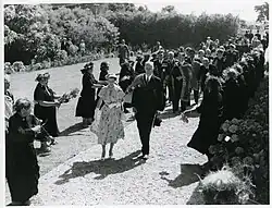 The Treaty of Waitangi proper began on 5 February 1840 when a public meeting was held on the grounds in front of James Busby's residence. Lieutenant Governor Hobson read a proposed document to the 300 or so European and Māori who were in attendance and then provided the Māori chiefs an opportunity to speak. Initially, a large number of chiefs (including Te Kemara, Rewa and Moka Te Kainga-mataa) spoke against accepting the Crown's proposition to rule over Aotearoa.[9] Later in the proceedings a few chiefs began to entertain the idea; amongst the more notable chiefs to support the Crown were Te Wharerahi, Pumuka, and the two Hokianga chiefs, Tāmati Wāka Nene and his brother Eruera Maihi Patuone.[9]
