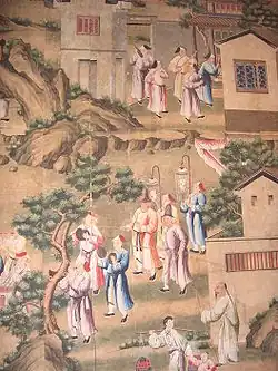 Towards the end of the 18th century the fashion for scenic wallpaper revived in both America and France, leading to some enormous panoramas, like the 1804 20 strip wide panorama, Sauvages de la Mer du Pacifique (Savages of the Pacific), designed by the artist Jean-Gabriel Charvet for the French manufacturer Joseph Dufour et Cie showing the Voyages of Captain Cook.[3] This famous so-called "papier peint" wallpaper is still in situ in Ham House, Peabody, Massachusetts.[4] It was the largest panoramic wallpaper of its time, and marked the burgeoning of a French industry in panoramic wallpapers. Dufour realized almost immediate success from the sale of these papers and enjoyed a lively trade with America. The Neoclassical style currently in favour worked well in houses of the Federal period with Charvet's elegant designs. Like most 18th-century wallpapers, the panorama was designed to be hung above a dado.