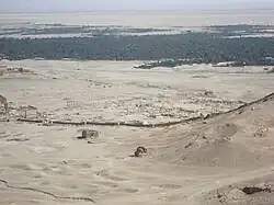 These walls were constructed in the first century AD, but they did not form a circuit around Palmyra.[1] They did not include protective towers,[2] and not only surrounded the residential areas, but also the gardens of the oasis which allowed Palmyra to exist. Many areas where natural formations provided protection were not fortified; for example, the western side of the city, naturally protected by the slopes of the Palmyrene mountains, was not protected by those walls. These early fortifications provided the city and its garden with protection against the sands of the Syrian Desert, kept the Bedouin bandits outside, and enabled the city to control the commercial activities.[3]