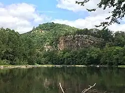 Wappocomo farm is located within the relatively flat floodplain of the South Branch Potomac River valley, to the north of Romney.[62] The farm's property adjoins the Valley View farm and Romney corporate limits to the southwest, the South Branch Potomac River to the west and north, and the South Branch Valley Railroad line and Cumberland Road (West Virginia Route 28) to the east. Mill Creek Mountain, a narrow anticlinal mountain ridge, rises to the west of the opposite riverbank of the South Branch Potomac River, and the western foothills of South Branch Mountain rise to the east.[62][63][64] Mill Creek and South Branch Mountains contain Appalachian-Blue Ridge forests of hardwoods and pine.[65] Hanging Rocks, cliffs of stratified Oriskany sandstone and limestone layers, are located within a gap where the South Branch Potomac River cuts through Mill Creek Mountain approximately 3 miles (4.8 km) north of Wappocomo farm.[66] The unincorporated area at Hanging Rocks is known similarly as Wapocomo (or Wappocomo).[67][68]