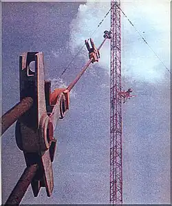 The Warsaw radio mast was a guyed steel lattice mast of equilateral triangular cross section, with a face width of 4.8 metres (16 ft). The vertical steel tubes forming the structures of the mast had a diameter of 245 millimetres (10 in); the thickness of the walls of these tubes varied between 8–34 mm (0.31–1.33 in) depending on height. The mast consisted of 86 sections, each of which had a length of 7.5 metres (25 ft). The mast had 3 arrays of guy wires, each array attached to the mast at 5 levels: 121.78 metres (399.5 ft), 256.78 metres (842.5 ft), 369.28 metres (1,211.5 ft), 481.78 metres (1,580.6 ft), and 594.28 metres (1,949.7 ft) above ground.[11][5] Each guy was fixed on a separate anchor block at the ground and was 50 millimetres (2.0 in) in diameter. To prevent the guy wires from interfering with the radio transmissions, the guys were insulated at regular intervals. The weight of guys and insulators used to anchor the mast was 80 tonnes (180,000 lb).[12][13] An elevator and separate protected ladders were installed in the interior of the mast to facilitate access to the various mast components, including the aircraft warning lamps. The elevator was designed by Alimak Hek, a Swedish company, and took 45 minutes to reach the top. The lift was nicknamed "Alimak", as a nod to the company that designed it. Safety was a priority, so "Alimak" was provided with an emergency stop function, but no incidents occurred that might have required it. A maximum of 3 people could ride up the elevator, although sources claim 3 people would have felt crowded. The elevator was powered by an internal combustion engine. An area for maintenance supplies was present, in order to transport materials such as lightbulbs for the aircraft warning lights. Inspection crews travelled up it once per month to replace light bulbs, and to watch for cracks in the steel. If a crack was found, the transmitters were turned off and the Raszyn radio mast took over the broadcast. Any cracks were then fixed by welders from Mostostal Zabrze by patching them with sheet metal.[14]