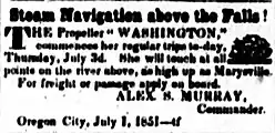 On June 19, 1851, Captain Murray was reported to have "arrived with his iron, steam propeller" apparently the Washington.[15] Murray was reported to be confident of navigating to Salem at any time of the year.[15] The arrival of the new steamer was praised by the editor of the Oregon City weekly newspaper, Oregon Spectator as a sign of progress.[15]