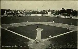 The second home of the Indianapolis Indians, from 1905 to 1931, is now referred to as the West Washington Street Park, but at the time was known as either Washington Park or Washington Baseball Grounds. The park was located at 1235 West Washington Street, just west of the White River (39°46′1″N 86°10′54″W / 39.76694°N 86.18167°W). Like its predecessor at Washington and Gray, this was a very rudimentary baseball venue with an all-wooden grandstand and a capacity of just over 4,000. In 1909 the park was completely rebuilt, and the seating capacity was enlarged to 20,000, the most in the minor leagues, due mainly to the addition of extensive bleacher sections. It also boasted the largest playing field of any minor league park, and was larger than many major league parks of the era. Aside from hosting the American Association's Indians, this venue was home to the Indianapolis ABCs of the Negro National League from 1920 to 1926.[1] The second ballpark also served as the home field for the 1911 Butler Christians football team.[2][3]