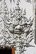 The principal building, the ubosot, is an all-white building with fragments of mirrored glass embedded in its exterior. It embodies design elements from classic Thai architecture, such as the three-tiered roof and abundant use of Nāga serpents.[5] "Inside the temple, the decor swiftly moves from pristine white to fiery and bewildering. Murals depict swirling orange flames and demon faces, interspersed with Western idols such as Michael Jackson, Neo from The Matrix, Freddy Krueger, and a T-800 series Terminator. Images of nuclear warfare, terrorist attacks such as the World Trade Center attack, and oil pumps hammer home the destructive impact that humans have had on earth. The presence of Harry Potter, Superman, and Hello Kitty confuses the message somewhat, but the overall moral is clear: people are wicked.[8]