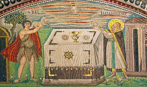 Inscribed silver bowl, height 11.5 cm, width 17 cm, weight 663 g. (1975,1002.5). Badly damaged at the base on one side, the bowl has inscriptions: under the base, the name "PUBLIANUS", and round the rim a regular hexameter line:"SANCTUM ALTARE TUUM DOMINE SUBNIXUS HONORO" engraved alongside two chi-rho monograms. The exact context of the inscriptions have been debated but "O Lord, I Publianus, relying on you, honour your holy altar [or church]." is probably the sense. The bowl is therefore marked as a votive offering, and associates the treasure with a church, or perhaps the private chapel of a large house.[6] Whilst this is not like other ancient chalices known for Christian worship, it may indeed be the oldest known chalice in existence. Its design is like that of a chalice depicted in the mosaics of the Basilica of San Vitale in Ravenna. Melchizedek and Abel stand making offerings, not to a pagan altar with a fire, but to a table covered with a white cloth. On it are representations of two loaves, and jewelled example of a bowl with handles identical to the Water Newton Chalice.