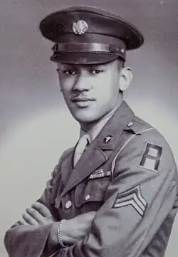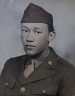 After the entry of the United States into World War II, Woodson – then in his sophomore year – put his studies on hold, enlisting in the United States Army on December 15, 1942, alongside his younger brother Eugene.[5][6] After scoring highly on an aptitude test, he joined the Anti-Aircraft Artillery Officer Candidate School, where he was one of only two African Americans. Before completing the course, Woodson was informed that he would not be able to be billeted in the United States Army Coast Artillery Corps due to his race.[1][6][7] As a result, he was retrained as a combat medic and assigned to the 320th Barrage Balloon Battalion.[8] Woodson underwent training at Camp Tyson, the United States' barrage balloon training center in Paris, Tennessee, where he experienced segregation and discrimination.[9][10][11] By the time of Operation Overlord, he held the rank of corporal.[12][13][14] In advance of Operation Overlord, Woodson was deployed to England.[15]