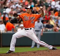 Chen was an "extreme flyball pitcher", at one point having an HR/9 innings of 1.3, way above MLB average.[41] Chen pitched from a three-quarters arm slot and threw a four-seam fastball averaging 91–92 mph (which topped out at 95–96 mph).[42] In addition, he threw a two-seamer, a slider, a changeup, and an occasional curveball.[42] Since he previously pitched in Japan where he started on five days rest rather than four, with the Orioles he initially had durability issues and was 0–4 in his last seven starts in 2012.[43] Chen has been described as a legitimate middle-of-the-rotation starter.[44][45] An opposing scout said, "I watched Wei-Yin Chen and swore I was watching Tom Glavine. He has such an effortless delivery and an above-average change up, and knows how to pitch inside."[46]