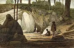 The Wellington region was long inhabited by the 'Binjang mob' of the Wiradjuri people. While there is no direct evidence that they entered any of the caves at Wellington, there is indirect evidence that they were well aware of them. A picture painted by Augustus Earle around 1826 (see image at right) clearly shows Aboriginal people in front of a fire at the entrance to Cathedral Cave; although labelled 'Mosman's Cave', it is clearly the entrance to Cathedral Cave — and such is the first written record of the caves.
