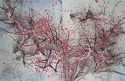Beginning in 2001, Tongson started to experiment with finger painting. By 2009, he had virtually ceased using brushes.[6]: 58 He adopted “Mountain Taoist” (Chinese: 山斗道人; pinyin: Shandou Daoren) as his sobriquet,[8] which he used to sign his finger paintings,[5] such as Plum 5 (2011) and Spiritual Mountains 7 (2012).[9]