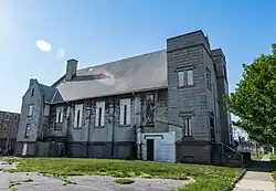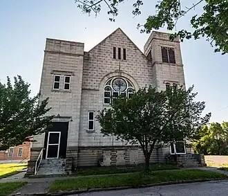 The building had elements of Greek and Romanesque Revival styles and was an early utilization of decorative concrete.[2] The structure had two asymmetrical towers between a gabled main facade, with entrances at each tower. Central to the facade was an arched opening which has a rose window and stone tracery. The exterior walls were made up of concrete masonry units. A new cornerstone read "Greater Christ Temple Apostolic Church" and "1974"; it replaced the original cornerstone.[3]