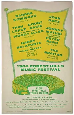 Poster for 1964 concerts at Forest Hills Tennis Stadium, headlining Barbra Streisand, Count Basie, Woody Allen, Johnny Mathis, Harry Belafonte, Peter Nero, and The Beatles.