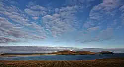 On the west side of the voe is the settlement of Scatness, while on the east side is the famous Jarlshof archaeological site.[1] There are Late Mesolithic and Early Neolithic remains at West Voe.[2]