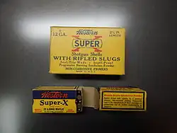 Rimfire cartridges bore a UCC headstamp, and product packaging included a Maltese cross trademark. The purchase of Alliance Cartridge Company in 1907 allowed UCC's merger into the Western Cartridge Company.[5][6] The early Maltese Cross trademark from the earlier Union Cap & Chemical Company was changed in 1909–1910 to a diamond with the Western name inside. This logo carried on into the 1930s. The well known Super-X branding arrived in the mid-1920s on shotgun shells and in 1930–1931 on .22 rim fire. This branding referenced the "X" ring on a target and was used only on high velocity cartridges.[7][8]