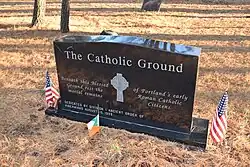 The Old Catholic Ground is an area in the cemetery used for Catholics, mainly (Irish) immigrants who arrived in the community in the early to mid 19th century, and for those who fled the Great Hunger from 1845 to 1852. People were buried in the Catholic section of the cemetery because there was no stand alone Catholic burial place in the community prior to 1858. The Catholic section is also known for headstones containing references to the names of counties in Ireland, and is built on what used to be known as Brown's Hill.[4] From 1858 through the 1870s, several dozen Catholic burials were removed from Western Cemetery and reinterred at the new Catholic Cemetery named Calvary Cemetery in South Portland, Maine when it opened in 1858. Calvary Cemetery is operated by the Diocese. In 1999, the Ancient Order of Hibernians, Division I, erected a stone marking the area as the Catholic Ground, and commemorating those who perished during, or fled from The Great Hunger (An Gorta Mór).