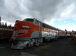 ![]() WP FP7 805-A from the Western Pacific Railroad Museum, on display in Sparks, Nevada in 2004. This locomotive once pulled the California Zephyr passenger train. | |