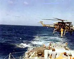 The increasing speed and attack range of the submarine threat, and the increased range at which this threat could be detected, led to a Royal Navy requirement for a "Manned Torpedo-Carrying Helicopter" (MATCH). Contemporary shipboard weapons did not have the necessary range, therefore MATCH was in essence a stand-off weapon with the helicopter carrying the torpedo or other weapon to the target and being instructed when and where to drop it.[1] Unlike the larger Westland Wessex, the Wasp carried no sonar of its own, and was limited strictly to working in partnership with its parent ship, other ships or other anti-submarine warfare (ASW) units.[2]