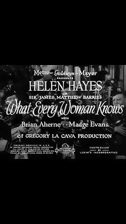What Every Woman Knows is a 1934 American romantic comedy film directed by Gregory La Cava and starring Helen Hayes, Brian Aherne and Madge Evans.[2] The film was produced and distributed by Metro-Goldwyn-Mayer and is based on the play What Every Woman Knows (1908) by J. M. Barrie. It was filmed by Paramount back in the silent era in 1921 and stars Lois Wilson. An even earlier British silent version was filmed in 1917. Hayes was familiar with the material as she had starred in a 1926 Broadway revival opposite Kenneth MacKenna.[3][4]