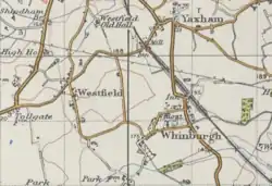 The civil parish is formed from the two ancient parishes which centred round the churches of St Mary's Whinburgh and St Andrew's Westfield, and until 1894 the churches performed all the functions of local government.[2] The County of Norfolk Review Order, 1935, sought to rationalise this, and under this Westfield parish was abolished and merged with Whinburgh parish; the name of the resultant parish was not changed from Whinburgh.[2] In August 1995, at the request of the Parish Council, Breckland Council sealed a 'Notice of the Change of Parish Name' and the parish then became Whinburgh and Westfield.[2]