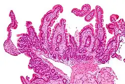 | Low magnification micrograph of Whipple's disease showing the characteristic foamy appearing infiltrate of the lamina propria. Duodenal biopsy. H&E stain. | |
