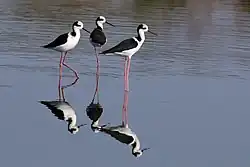 This stilt chooses mudflats, desiccated lacustrine verges, and levees for nest locations, as long as the soil is friable. The nests are typically sited within 1 km (0.62 mi) of a feeding location, and the pairs defend an extensive perimeter around groups of nests, patrolling in cooperation with their neighbors.[2] Spacing between nests is approximately 65 ft (20 m), but sometimes nests are within 7 ft (2.1 m) of each other and some nests in the rookery are as far as 130 ft (40 m) from the nearest neighbor. The nests are frequently established rather close to the water edge, so that their integrity is affected by rising water levels of ponds or tides. This is particularly a hazard in the case of managed salt ponds where water levels may be altered rapidly in the salt pond flooding process.[3]