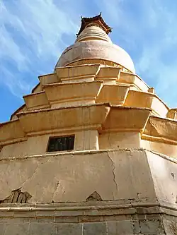 The pagoda is located about 2 km southwest of the centre of Dunhuang city. It was repaired in the Daoguang era (1821-1851) and again in 1992. It is 12 metres (39 feet) high and 7 metres (23 feet) in diameter and consists of 9 levels in total. The exterior is built of adobe bricks and is filled with grass and mud mixed with lime. The base is in the form of an eight-spoked wheel, the 1st level has four sides, while levels 2 to 4 have folding corners, the 5th level is decorated with upturned lotuses, the 6th is in the shape of an overturned bowl, the 7th level is wheel-shaped, while the 8th level has a hexagonal plate at the top of the pagoda with big wind-bells hanging on every corner.[2] Above that are three metal balls surmounted by a trident. Local people say the chime of the bells are an echo of the neighing of the horse.